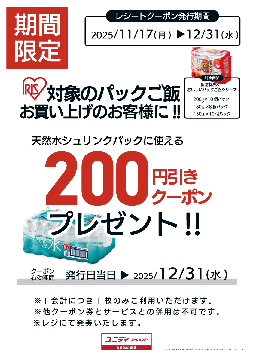 対象のパックご飯をお買い上げで「富士山の天然水」シュリンクパック200円引きクーポンプレゼント!!✨