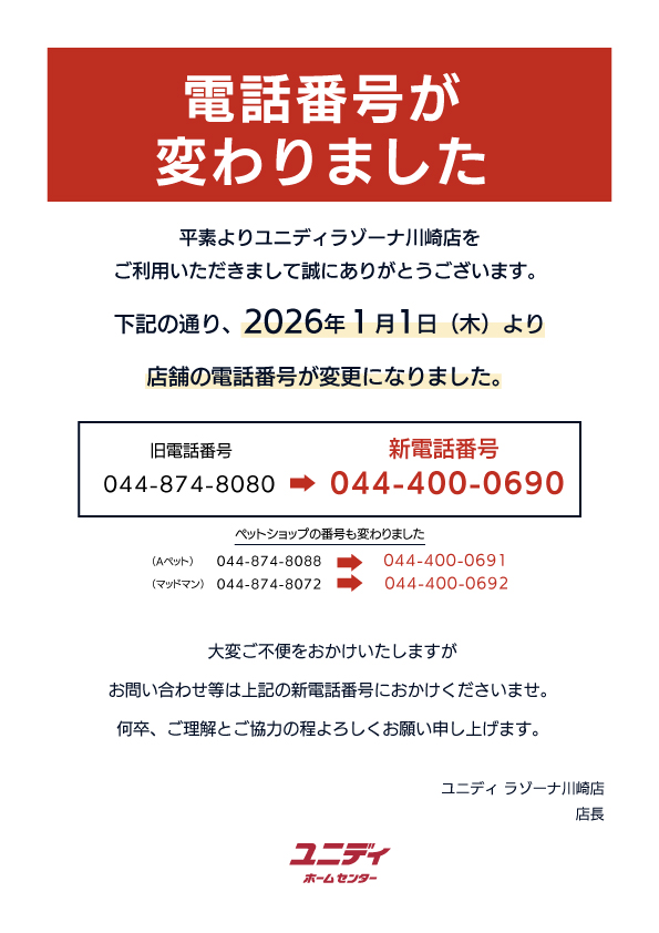 ユニディラゾーナ川崎店の電話番号変更が変わりました
