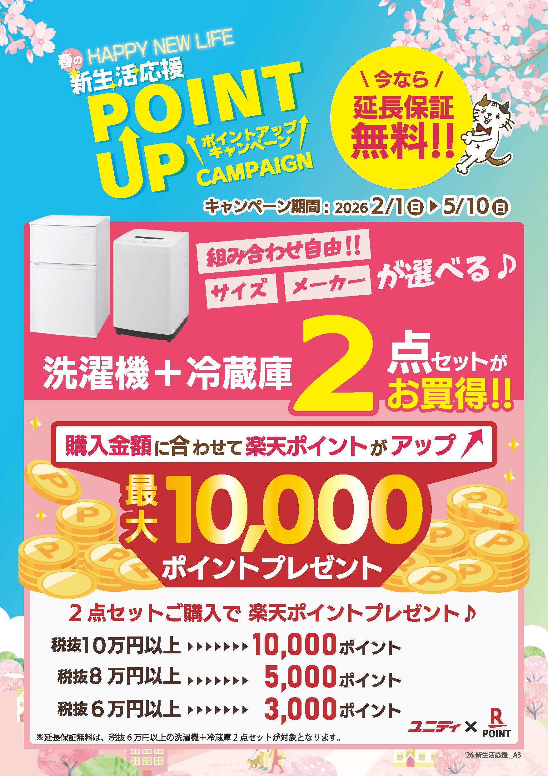 冷蔵庫+洗濯機2点セットご購入で最大で楽天ポイント10,000ポイントプレゼント!