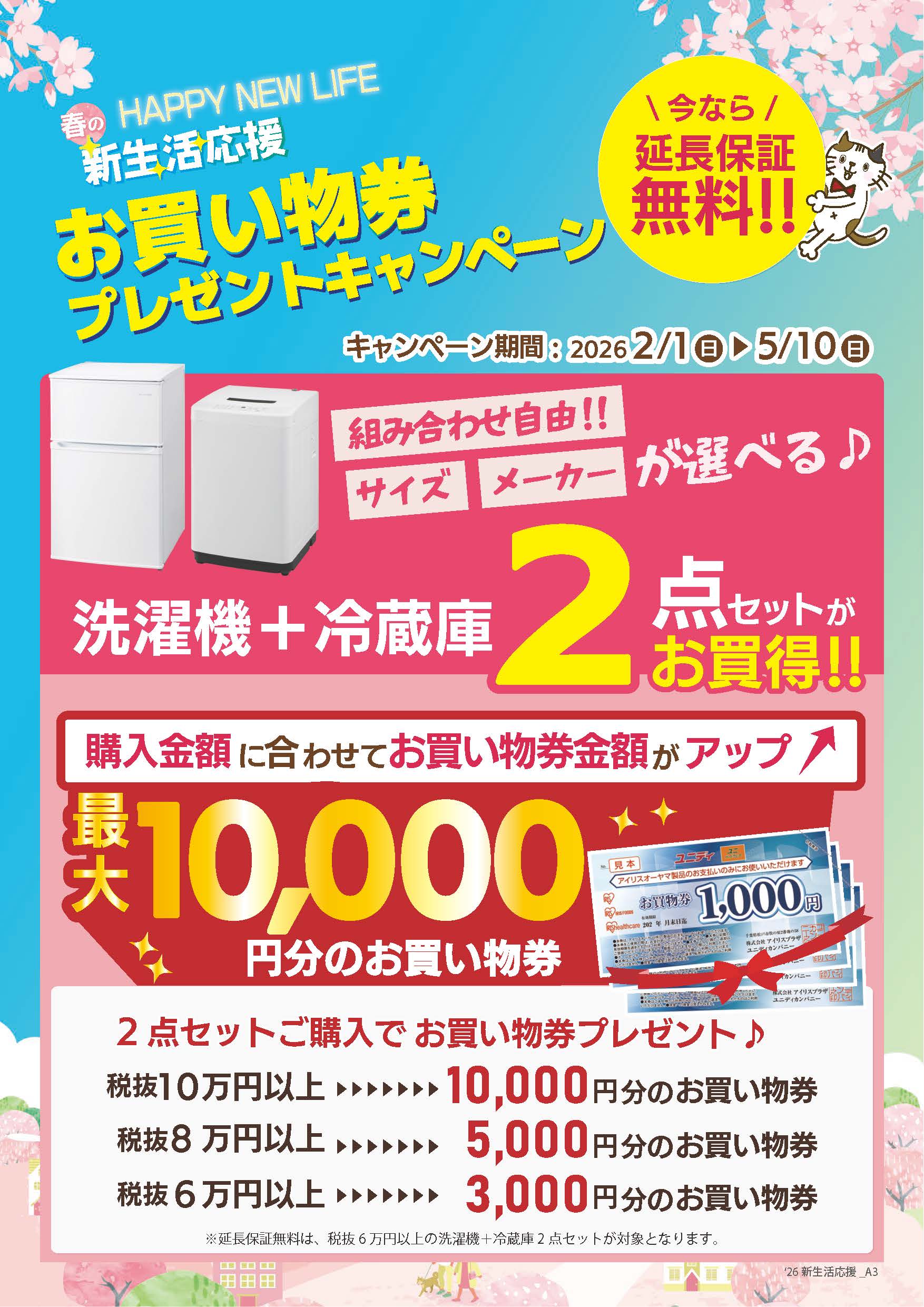 冷蔵庫+洗濯機2点セットご購入で最大でお買い物券10,000円分プレゼント!