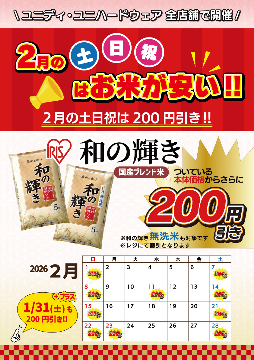 \2月の土日祝は国産ブレンド米「和の輝き」が200円引き/