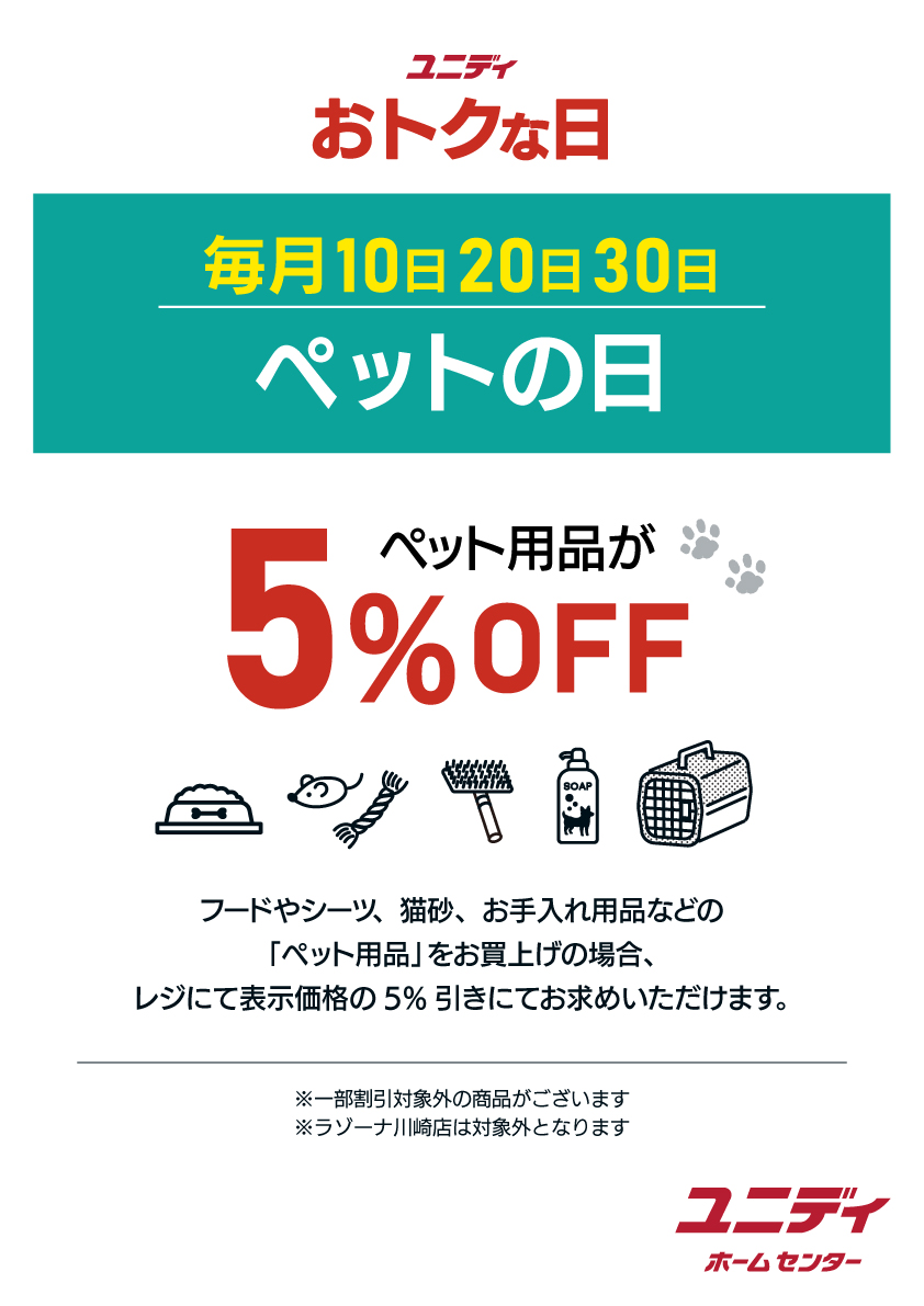毎月10・20・30日はペットの日!~ペット用品が5%OFF~