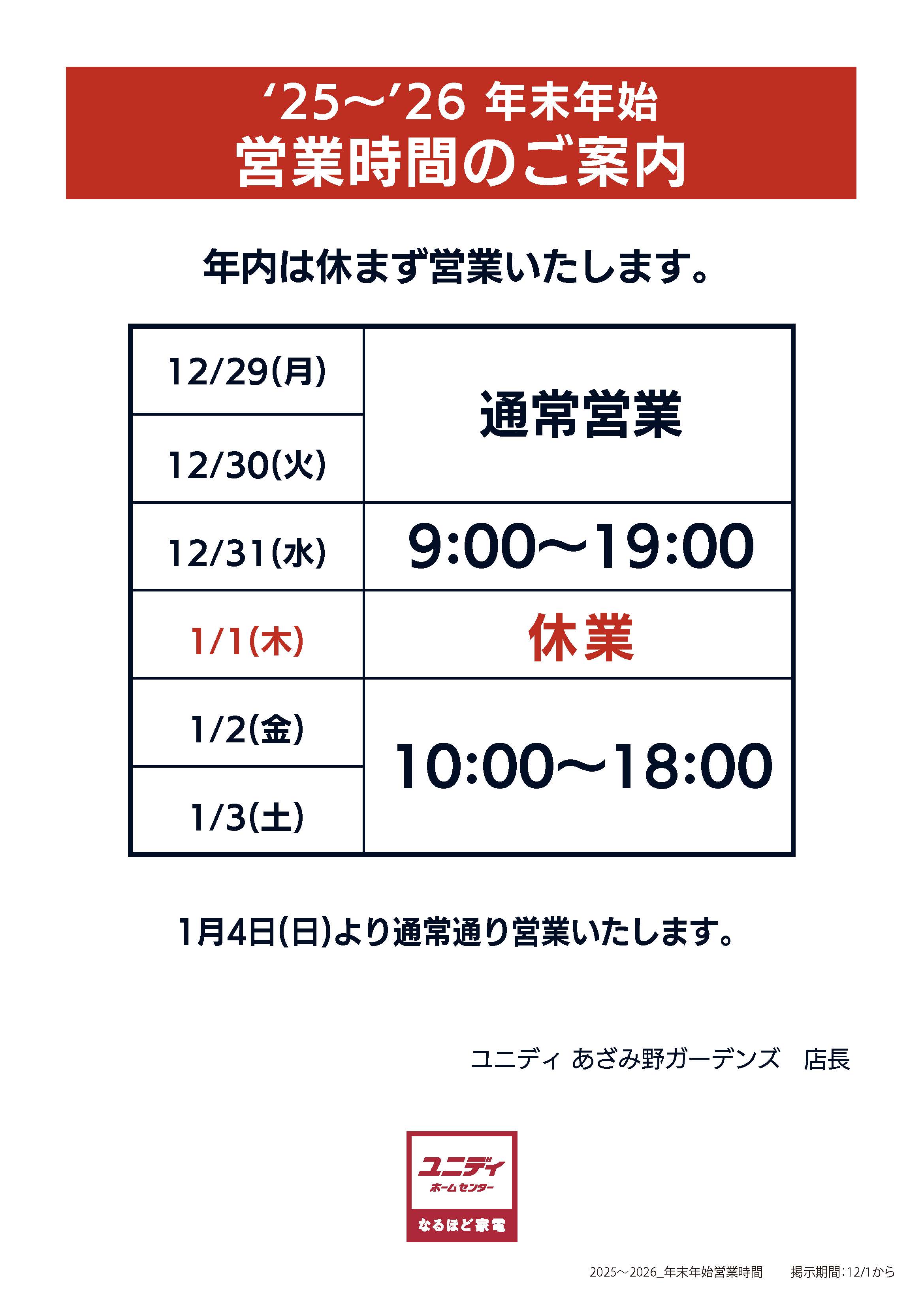 【あざみ野ガーデンズ】年末年始営業時間のご案内
