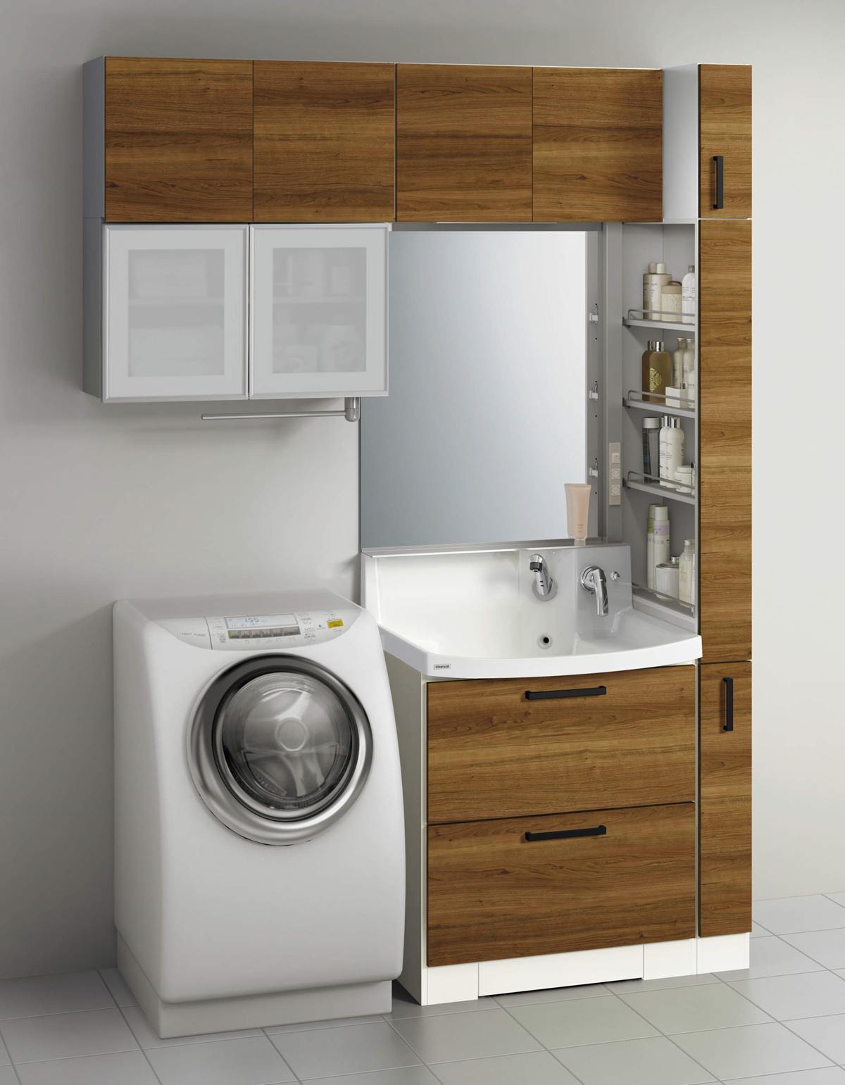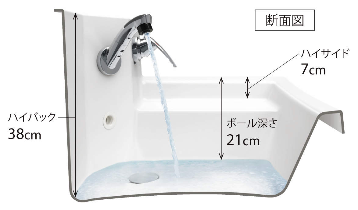 ウエットゾーンに加え、濡らしたくないものを分けて置く事ができるセミドライゾーンが増えて、ボールも大きくなりました。(間口900ミリの場合)