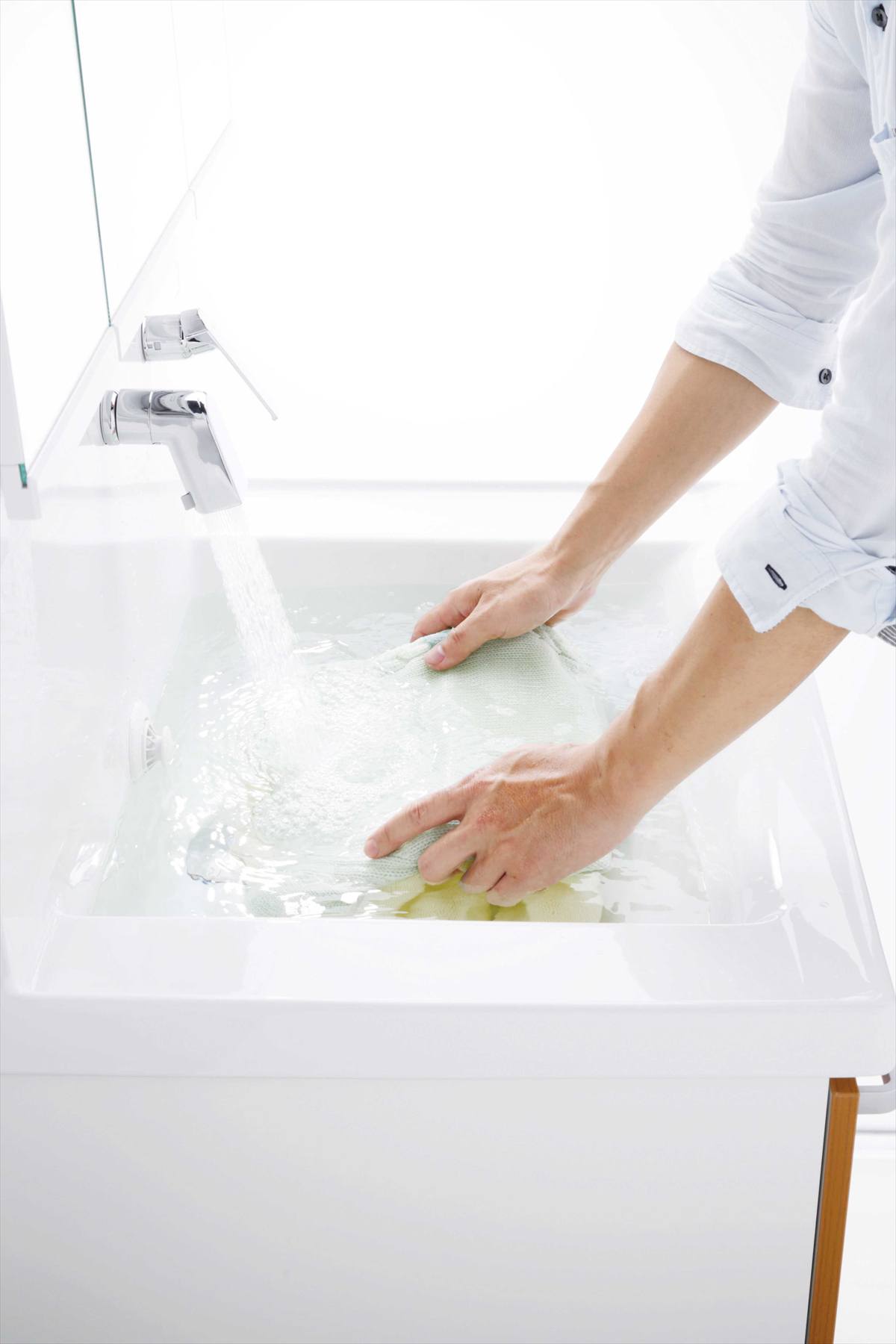 スクエア形状のシャープなボールは容量たっぷりでかさばるセーターもゆったり洗えます。サイドの物置スペースは一時置きに便利です。