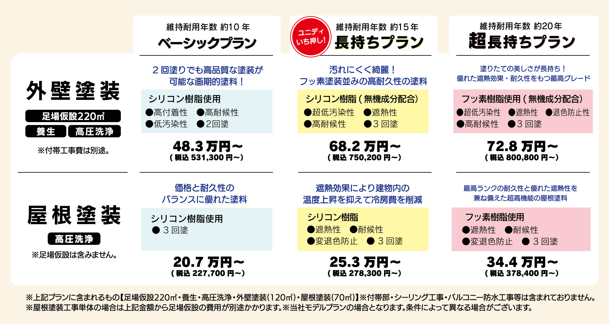 ユニディリフォームでは、目的やご予算、耐久年数に合わせて選べる3つの外壁塗装プランをご用意しています。